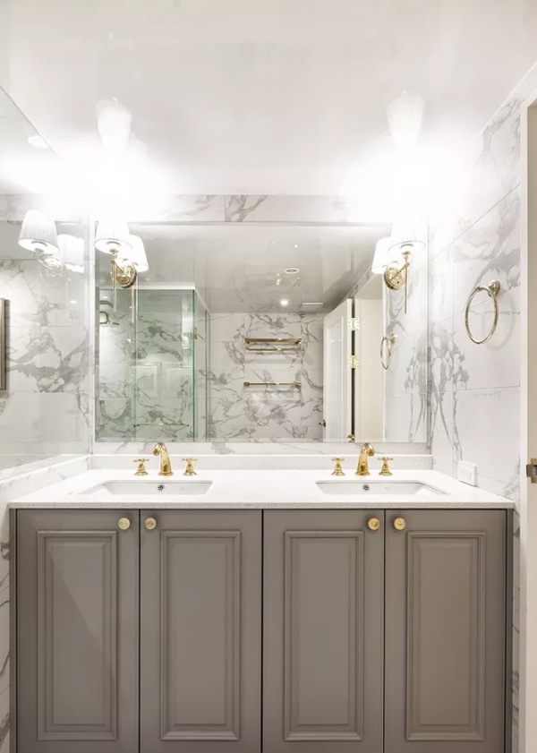 6、在洗手臺的鏡子前運用的燈光線,要運用防水防霧的,最好不要選用太亮的,以免造成炫目,用橘黃色的暖色燈營造出讓人放松的氣氛。